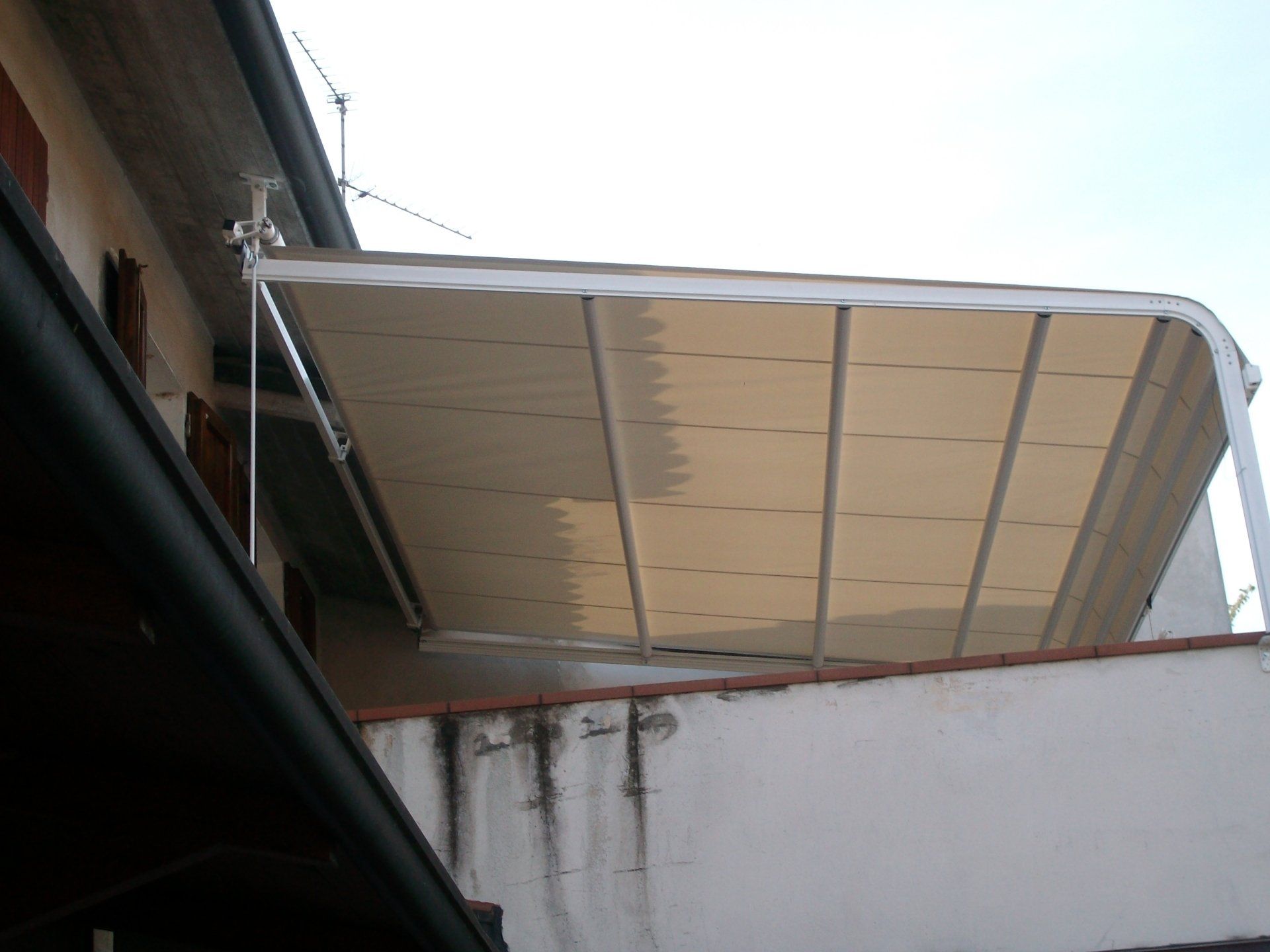 Tenda modello capottina con struttura a bracci concatenati su snodo fisso a muro.